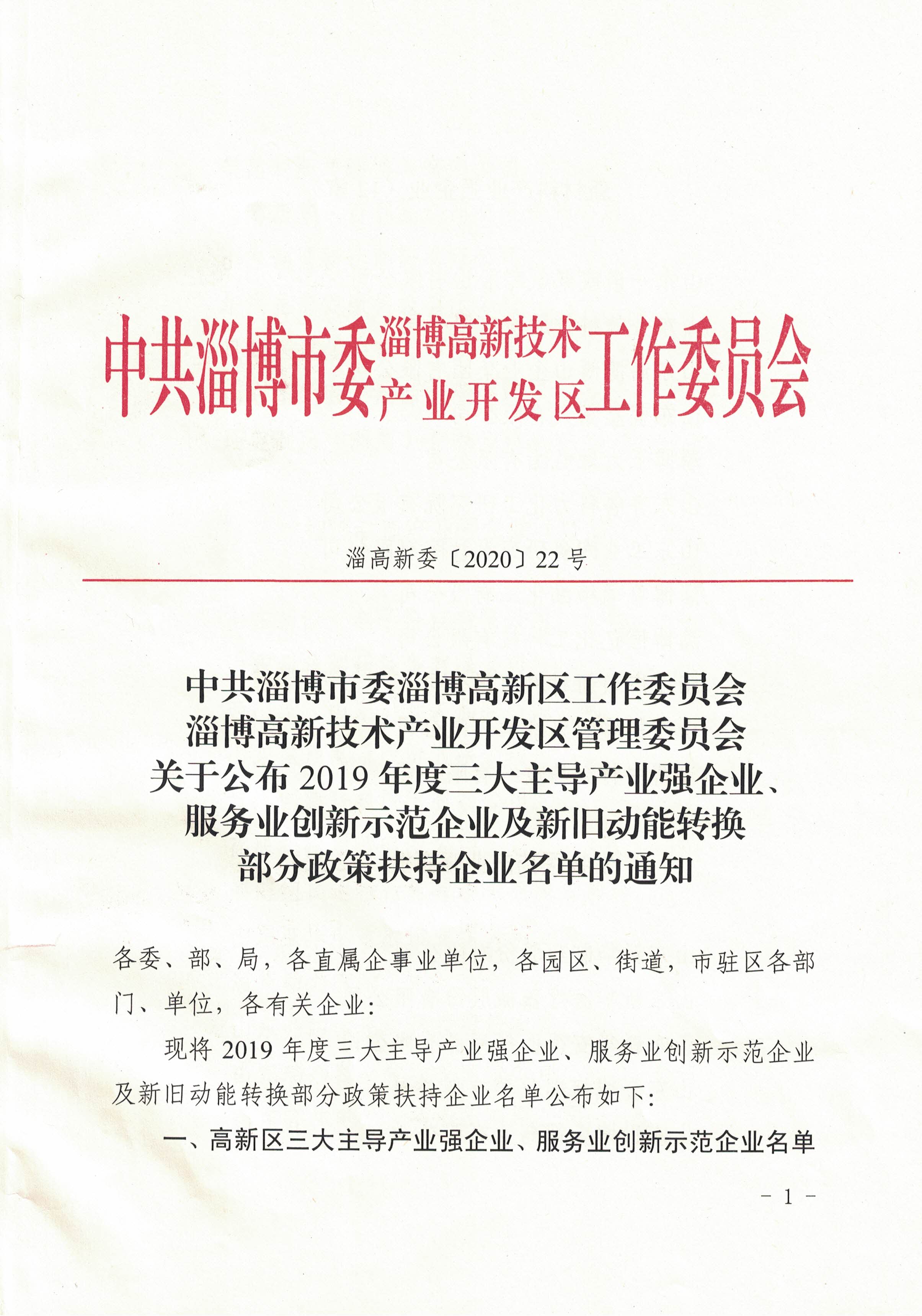 2020年4月28日,中共淄博市委淄博高新區工作委員會、淄博高新技術產業開發區管理委員會下發《關于公布2019年度三大主導產業強企業、服務業創新示范企業及新舊動能轉換部分政策扶持企業名單的通知》(淄高新委〔2020〕22號),山東齊信招標有限公司(簡稱齊信)等23家企業為2019年服務業創新示范企業。