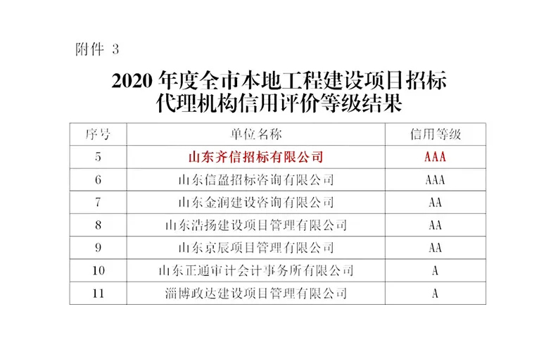 2021年5月,淄博市住建局發(fā)布《關(guān)于2020年度淄博市房地產(chǎn)開發(fā)企業(yè)等信用評(píng)價(jià)等級(jí)結(jié)果的通報(bào)》,齊信被評(píng)為淄博市工程建設(shè)項(xiàng)目招標(biāo)代理機(jī)構(gòu)AAA級(jí)信用企業(yè),列入行業(yè)誠信“紅名單”。