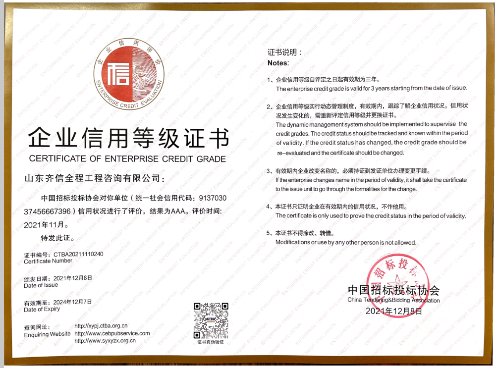 2021年12月,中國招標投標協會發布《招標代理機構2021年信用評價結果公示名單》,齊信獲評2021年招標代理機構信用評價AAA級企業(最高等級)。