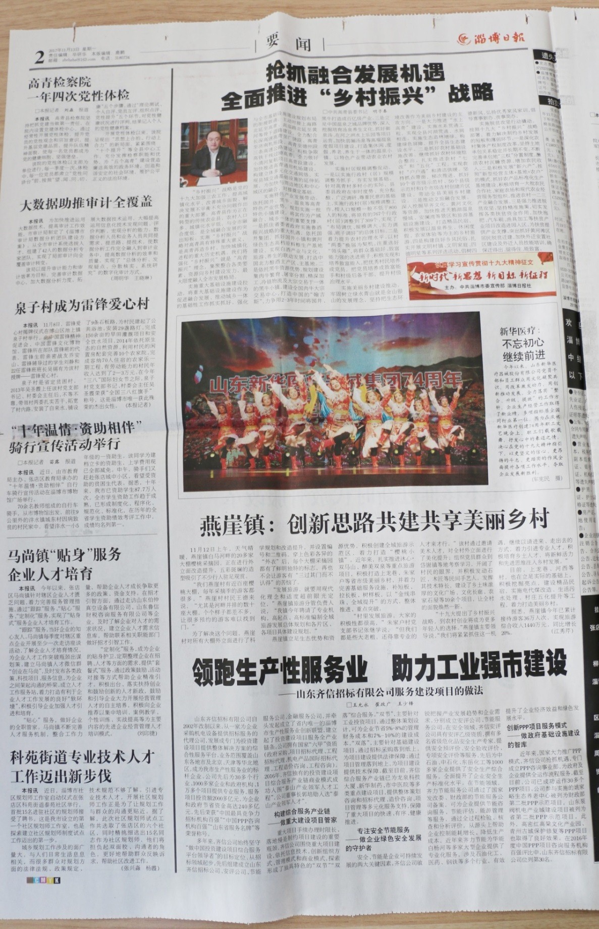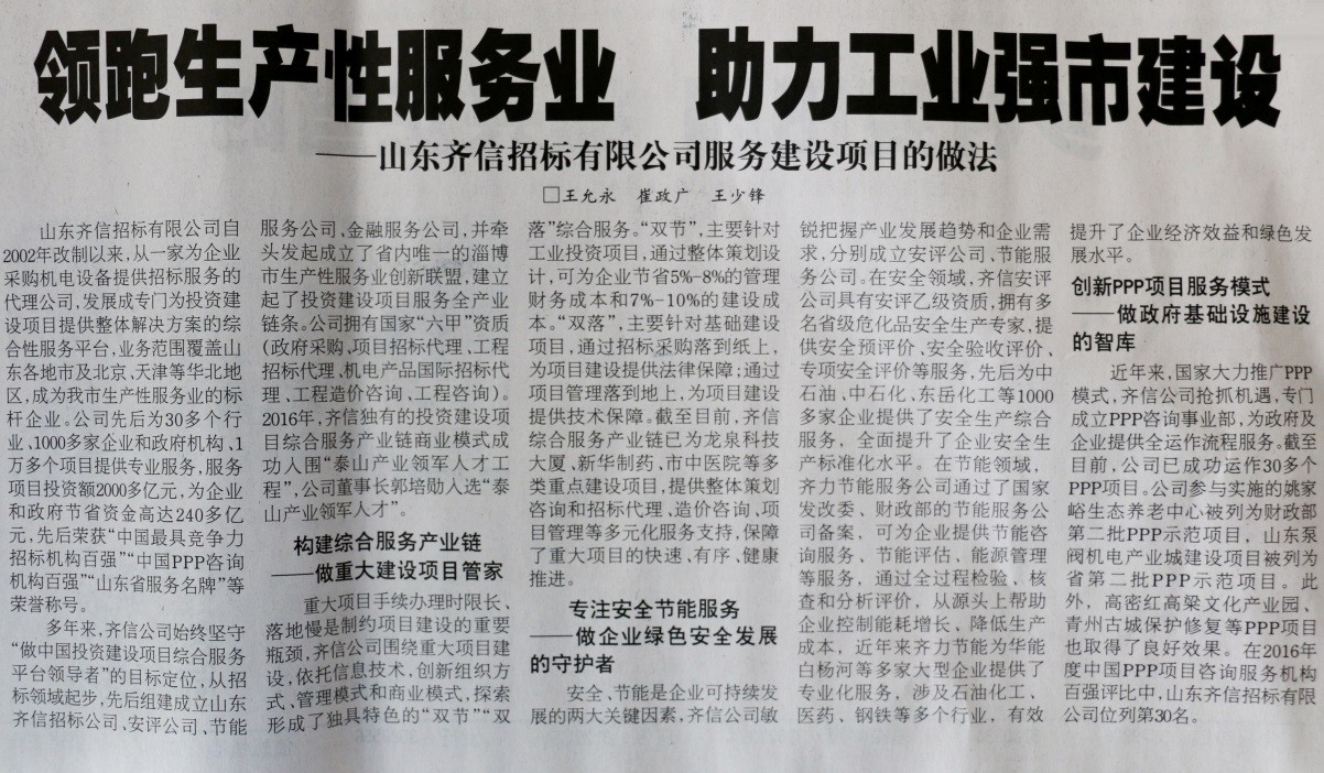 2017年11月13日,《淄博日報》用大幅版面對山東齊信招標有限公司服務進行了報道,高度肯定了公司的服務建設項目的做法。